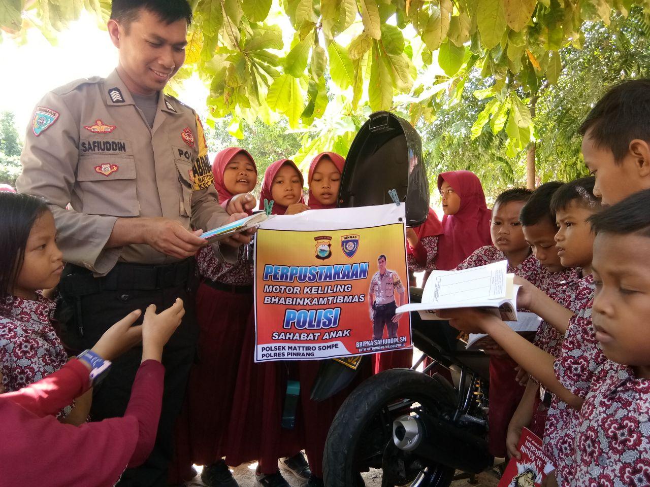Dalam kegiatan perpustakaan keliling, Bripka Safiuddin menyambangi siswa siswi SD Negeri 64 Lisse yang sedang beristirahat, kegiatan dilakukan dengan memanfaatkan Box sepeda motor dinas Bhabinkamtibmas dan diisi buku.