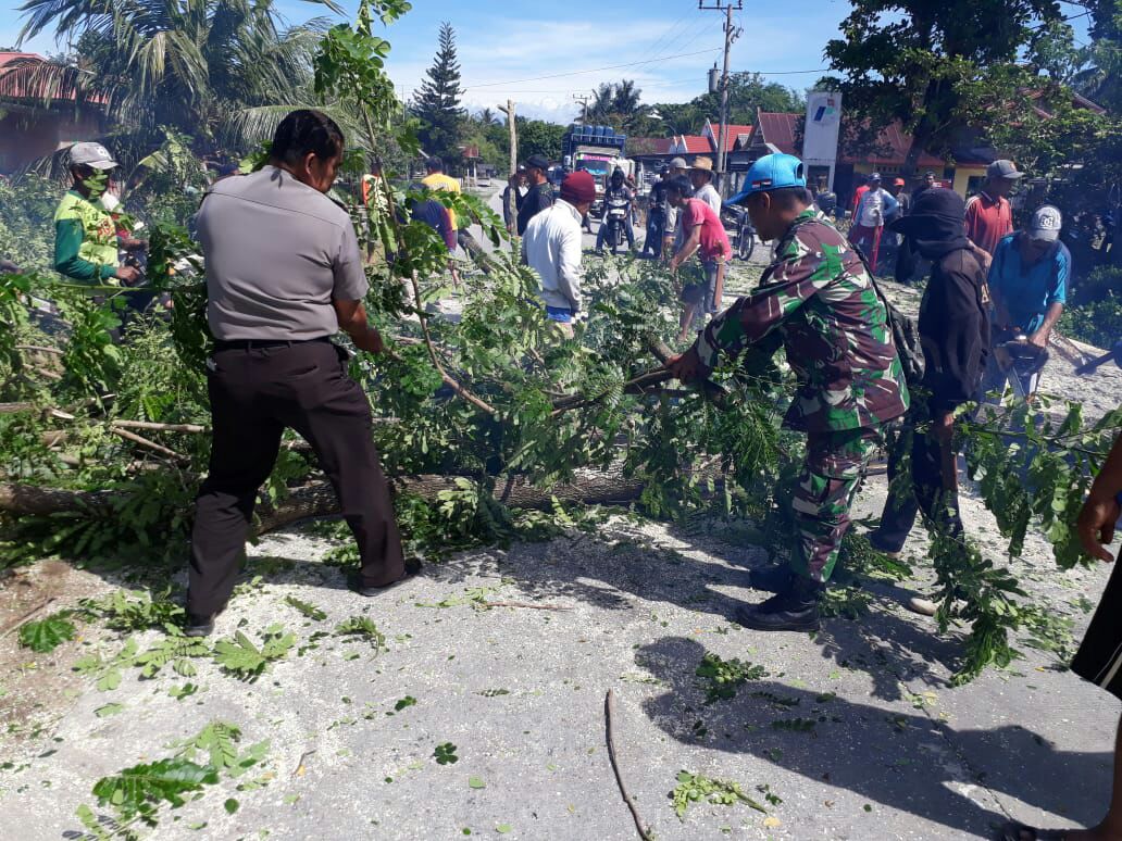 Adanya hujan yang disertai dengan angin kencang, sehingga dikhawatirkan pohon tua tumbang dan terjadi hal yang tak diinginkan yaitu menimpa pengendara yang lewat serta kabel listrik. Jadi hari ini dilakukan penebangan pohon kayu tua, guna mencegah hal tidak kita inginkan,” kata Aiptu Hartono.