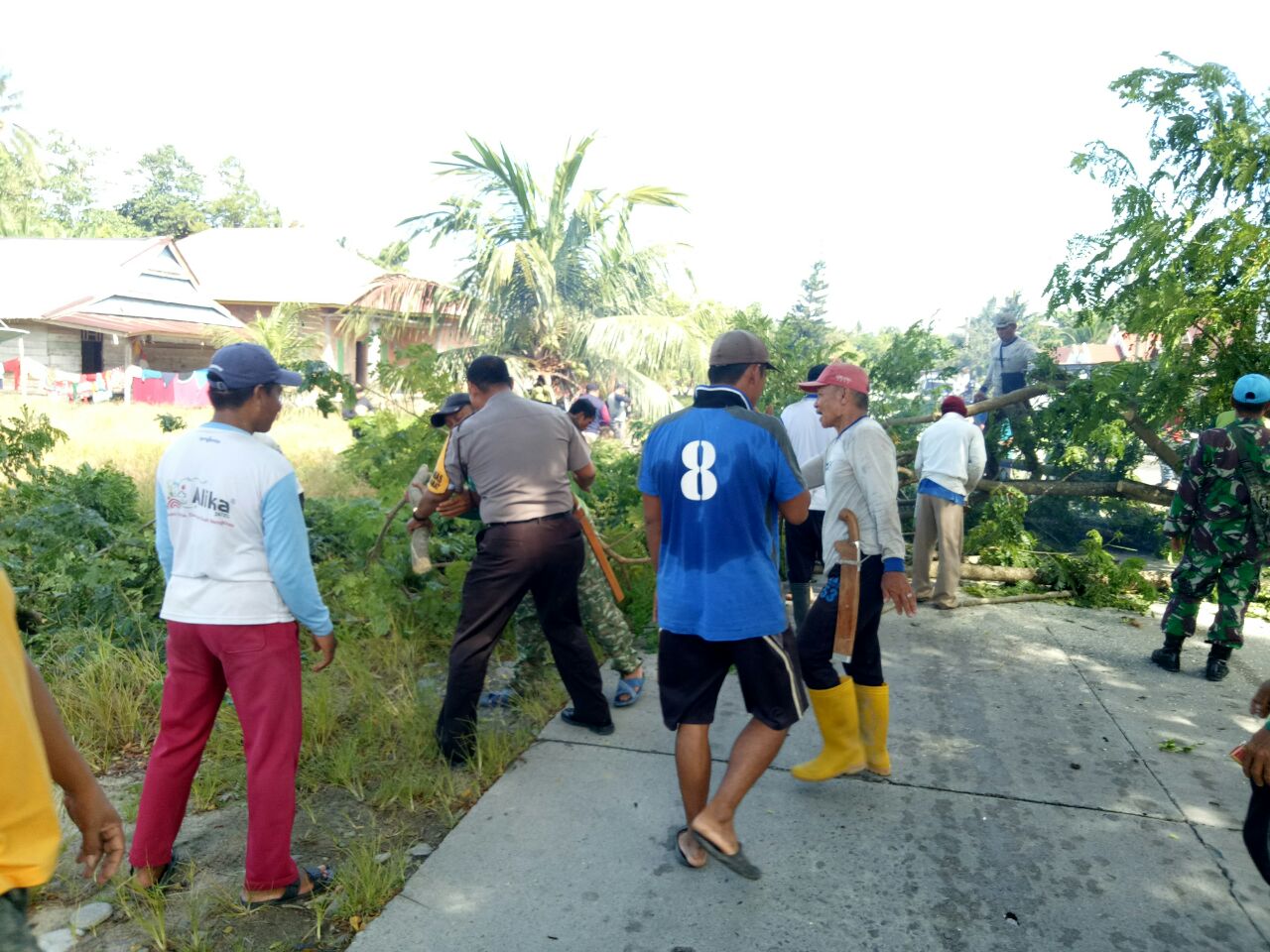 Adanya hujan yang disertai dengan angin kencang, sehingga dikhawatirkan pohon tua tumbang dan terjadi hal yang tak diinginkan yaitu menimpa pengendara yang lewat serta kabel listrik. Jadi hari ini dilakukan penebangan pohon kayu tua, guna mencegah hal tidak kita inginkan,” kata Aiptu Hartono.