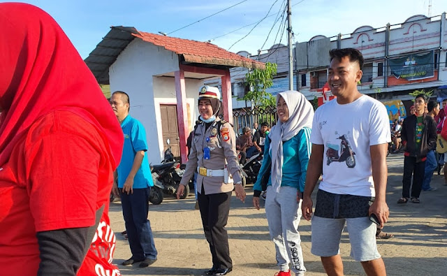selain Melaksanakakan pengamanan Ipda Nursanti, S.H., juga Menyapa warga masyarakat yang sedang Senam Kebugaran pagi ini sembari mengikuti gerakan senam.