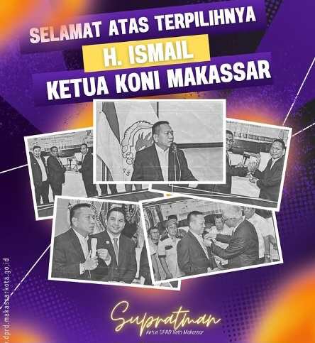 “Selamat Atas terpilihnya Bapak H.Ismail (Ketua Komisi B DPRD Kota Makassar) sebagai ketua KONI Makassar pada Pemilihan yang dilakukan secara aklamasi dalam Musyawarah Olahraga Kota Luar Biasa (Musorkotlub),” tulis akun media sosial DPRD Kota Makassar, Senin (28/4/2025).